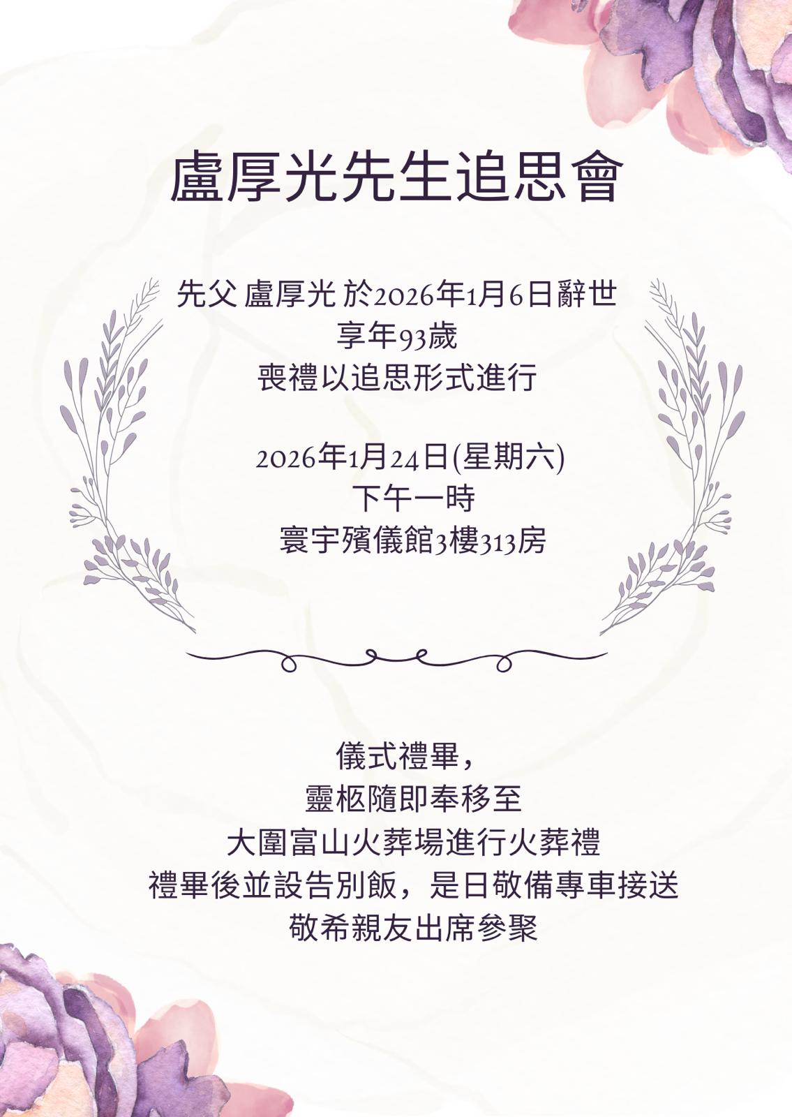 基榮耀團盧淑儀父親盧厚光先生喪禮安排詳情: