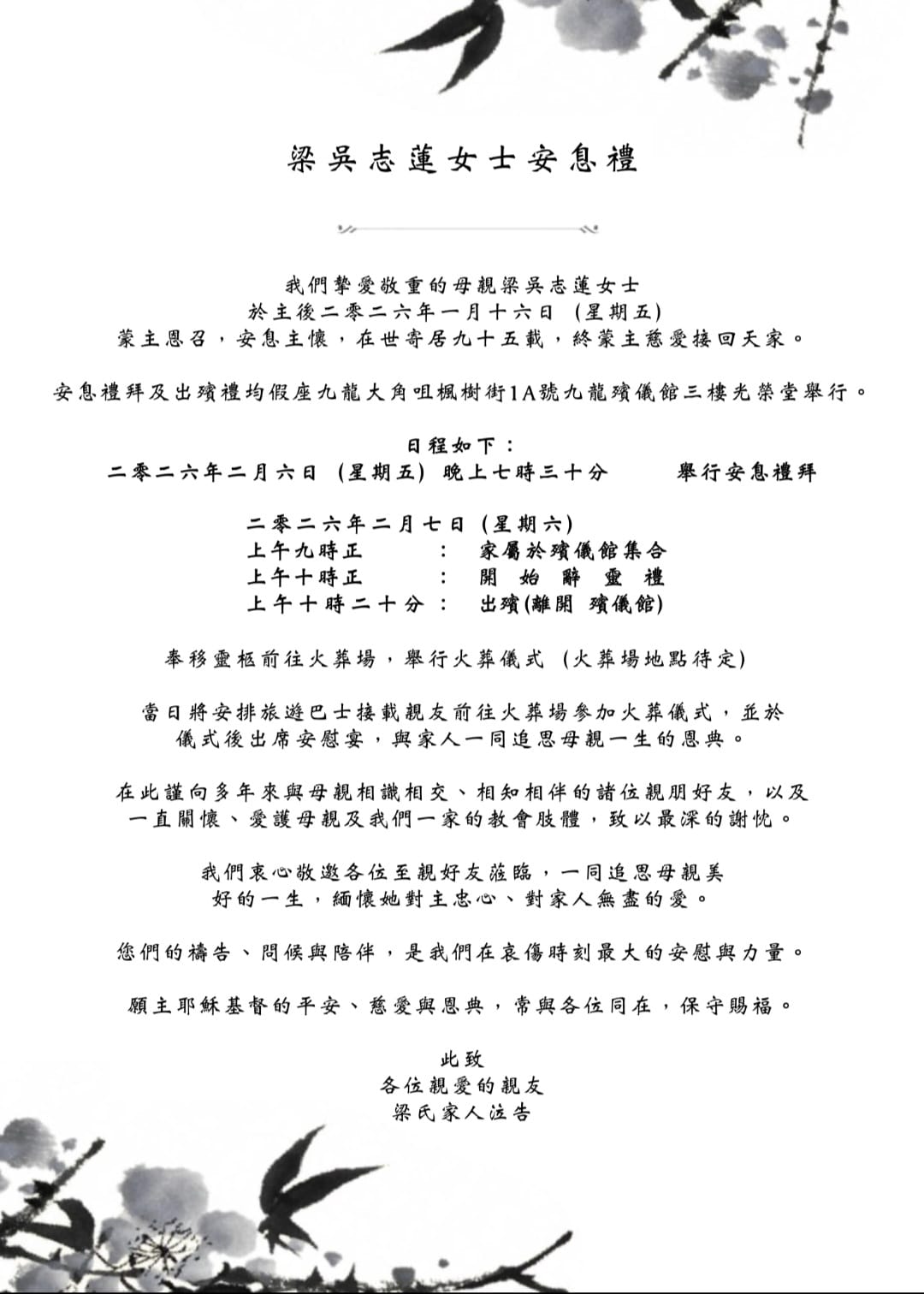 基道團梁綺明姊妹母親梁吳志蓮女士於2026年1月16日安息主懷。喪禮安排如下: